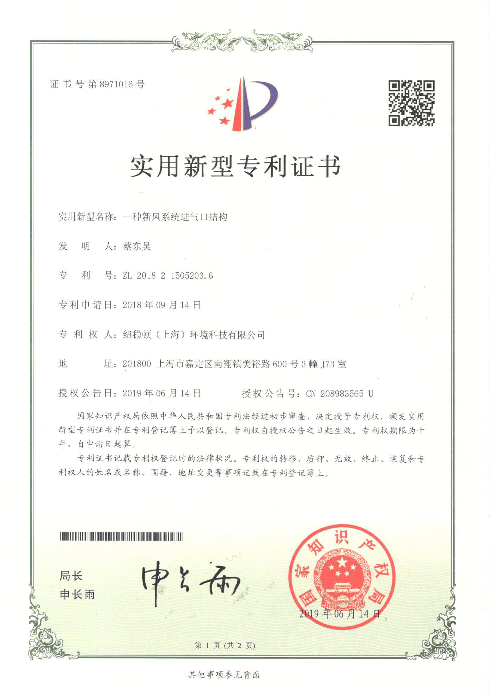 纽诺(中国)已获授权专利近20个,同时参与多项国家新风行业标准制定。
